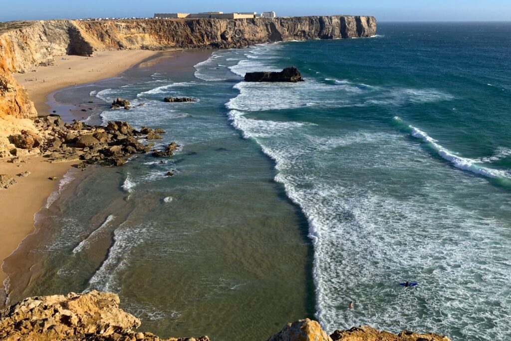 In full transparency, I visited Sagres, but I didn’t stay at a surf camp there. Still, I loved the vibe of this little surf town surrounded by dramatic landscapes and beaches at what feels like the ends of the earth. I’d probably opt to stay here instead of Lagos on my next surf trip to the Algarve.